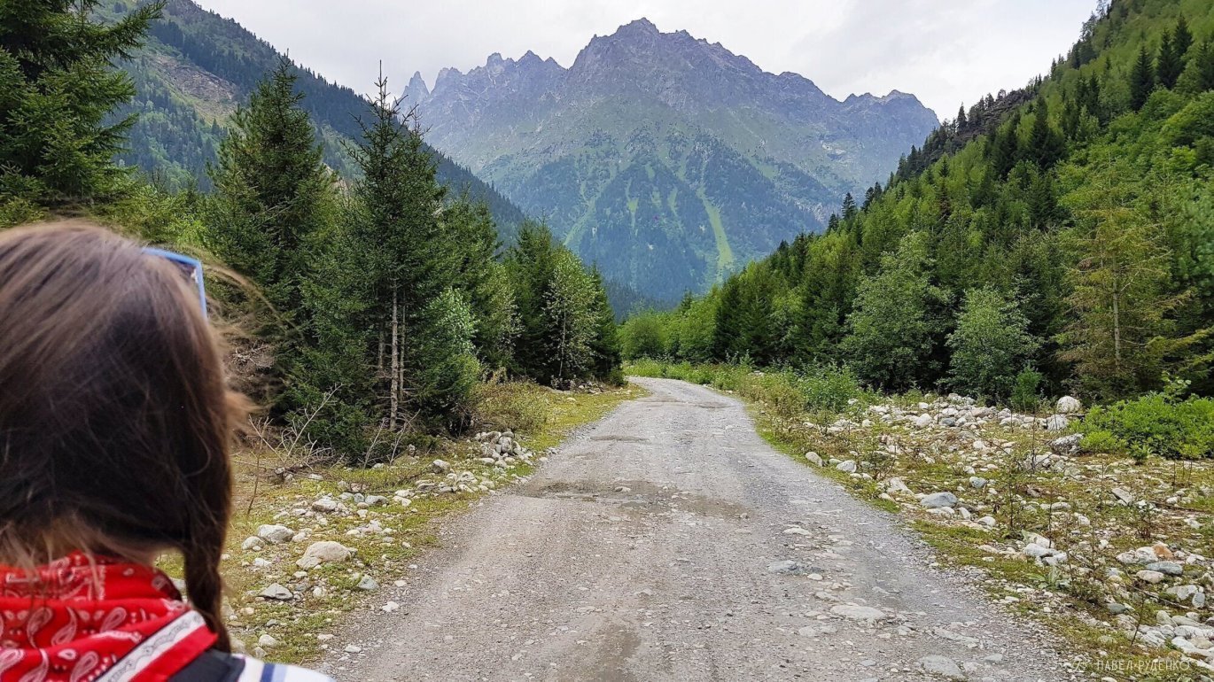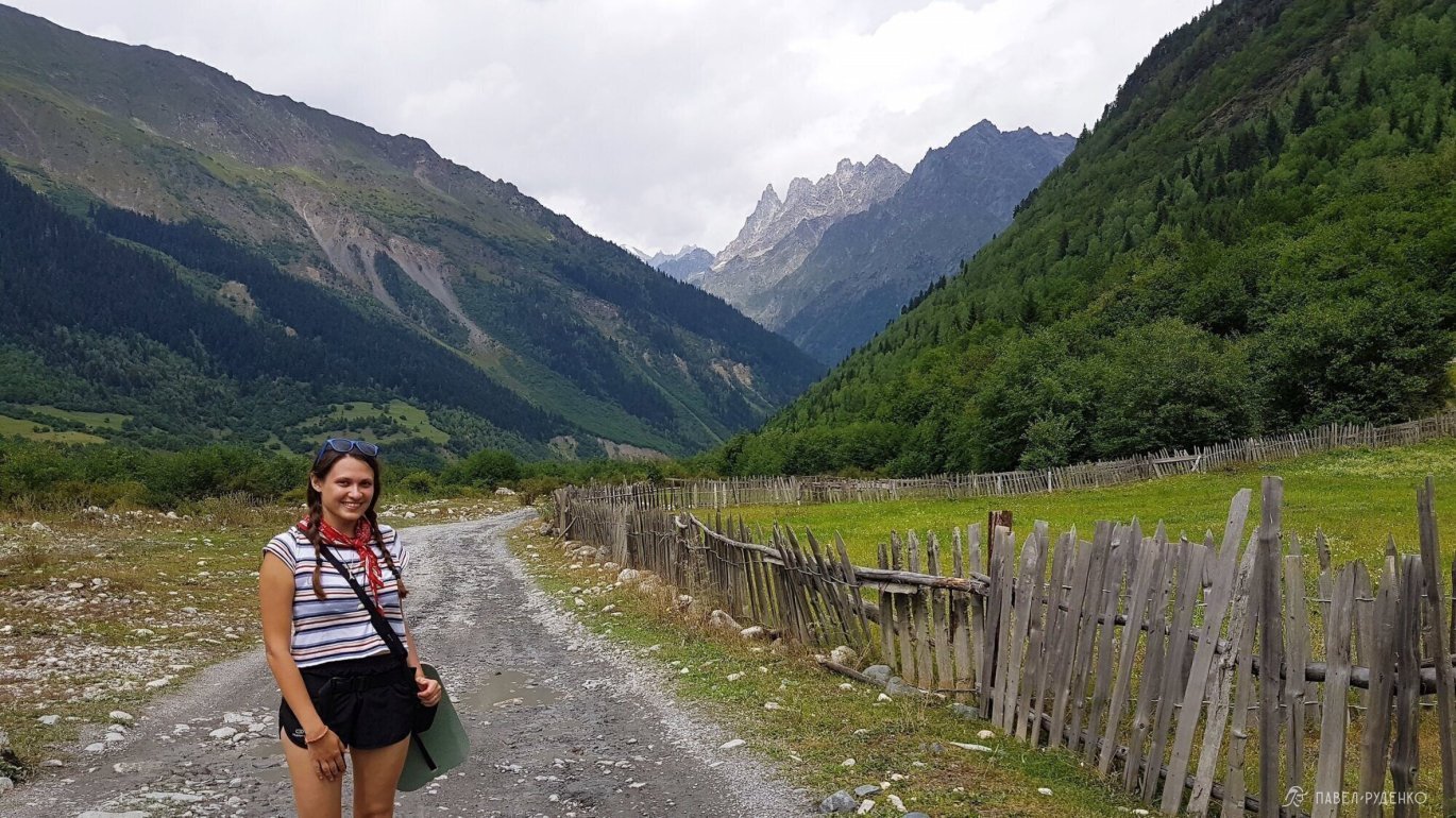 Первые 8 км. пути идет проселочная дорога вдоль реки Местиачала, ее можно преодолеть на машине или пройти пешком. Река может разливаться, будьте готовы к лужам и броду по щиколотку/колено. Этот путь не очень красив, поэтому можно пробежать пешком побыстрее, в среднем темпе за 3 часа.
