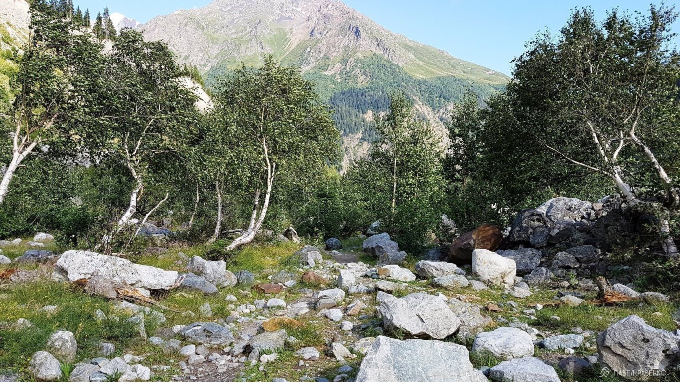 Дальше будут кусты, узкая тропа и выход на плоский, каменистый участок перед ледником. Мест для палаток здесь мало, но они есть. Тут же памятный камень.