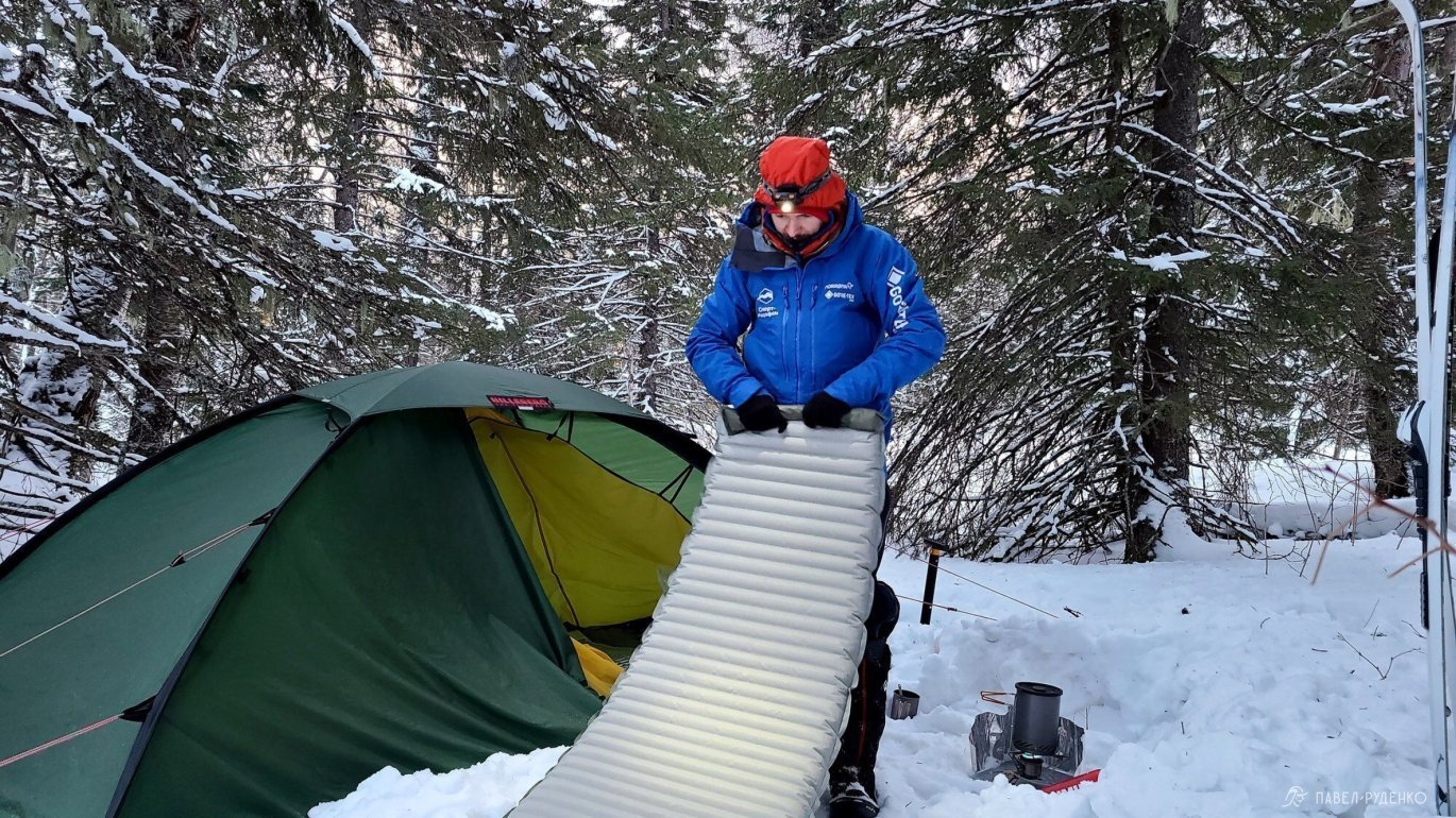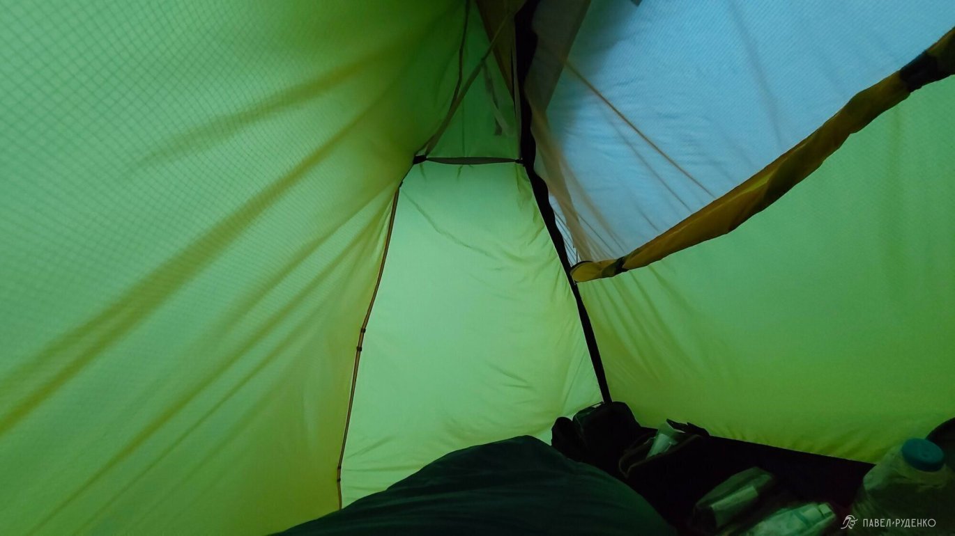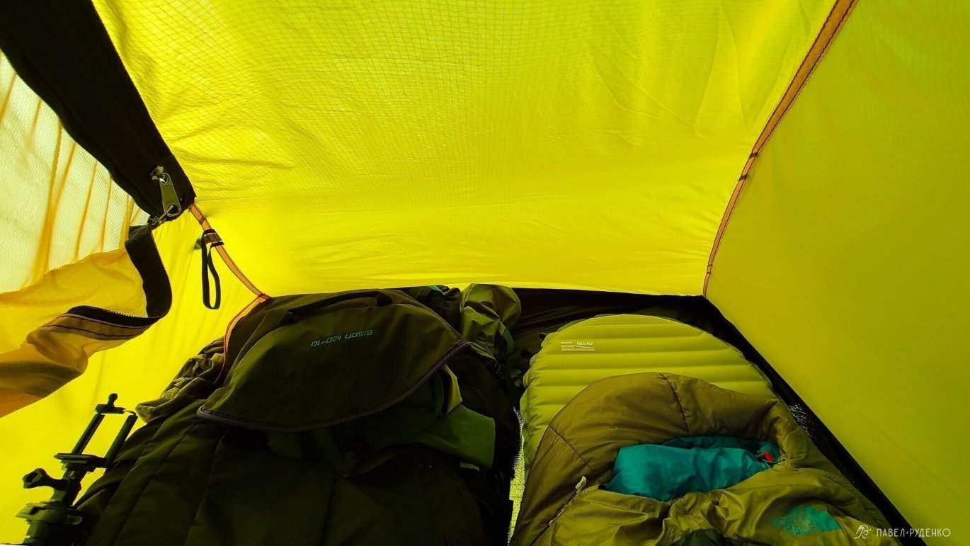 Супер просторная однушка, 100см в высоту, 110 в ширину, 230 в длину, что редко встречается и отлично подойдет высоким людям. Рюкзак и вещи находятся в палатке, очень нравится эта концепция, после использования 2-местных палаток в соло походах. Большой внутренний объем в зимних условиях обеспечивает меньше конденсата, меньше вероятность зацепить покрытые инеем стенки палатки, а также дает максимальный комфорт в длительных походах летом.