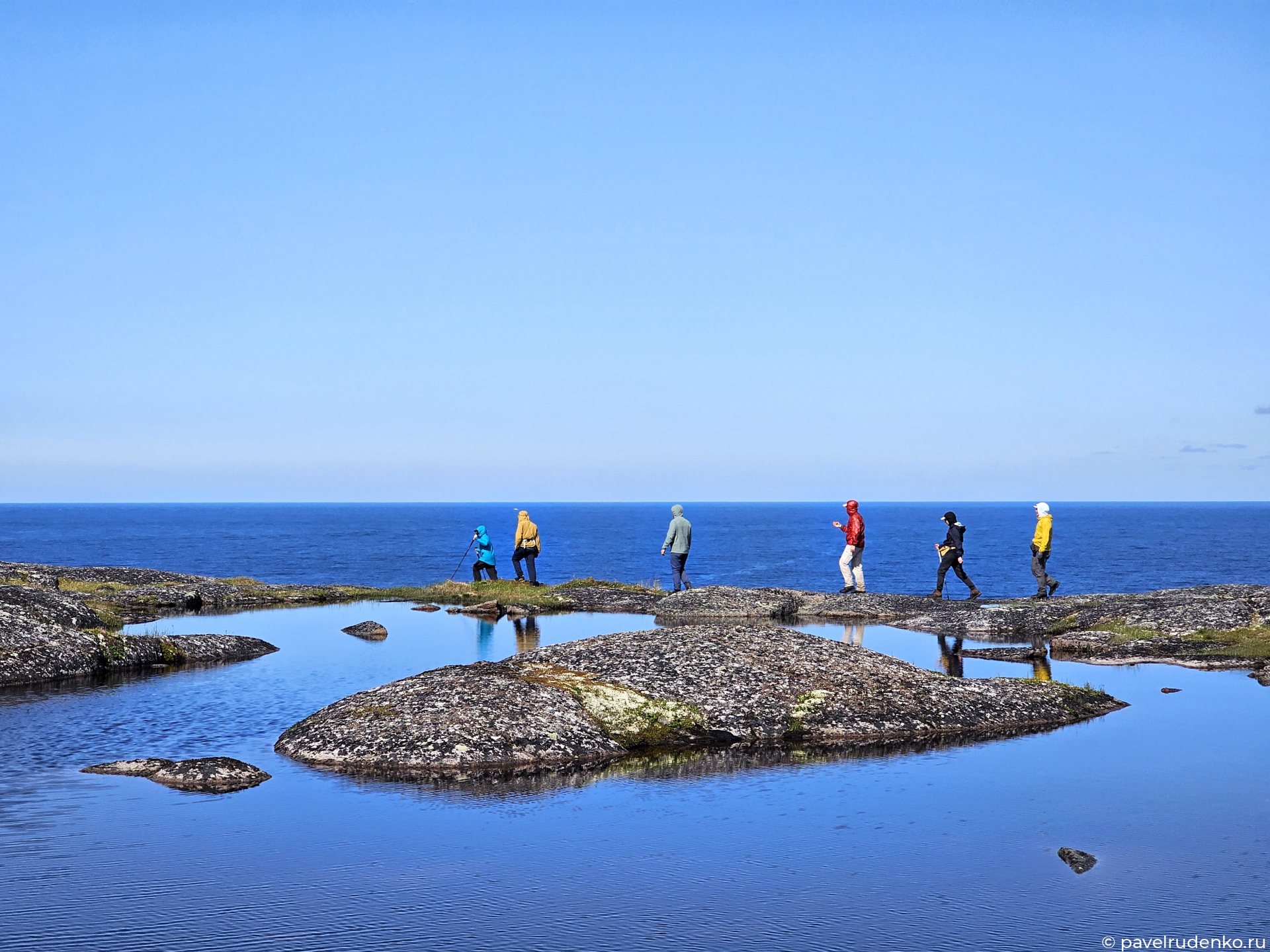 Маршрут насыщенный, распорядок дня адаптируем под приливы и отливы моря, когда вода падает на 3 метра и можно безопасности преодолеть водную преграду. Для комфорта используем специальные водонепроницаемые бахилы, которые сохранят ноги в тепле и сухости.