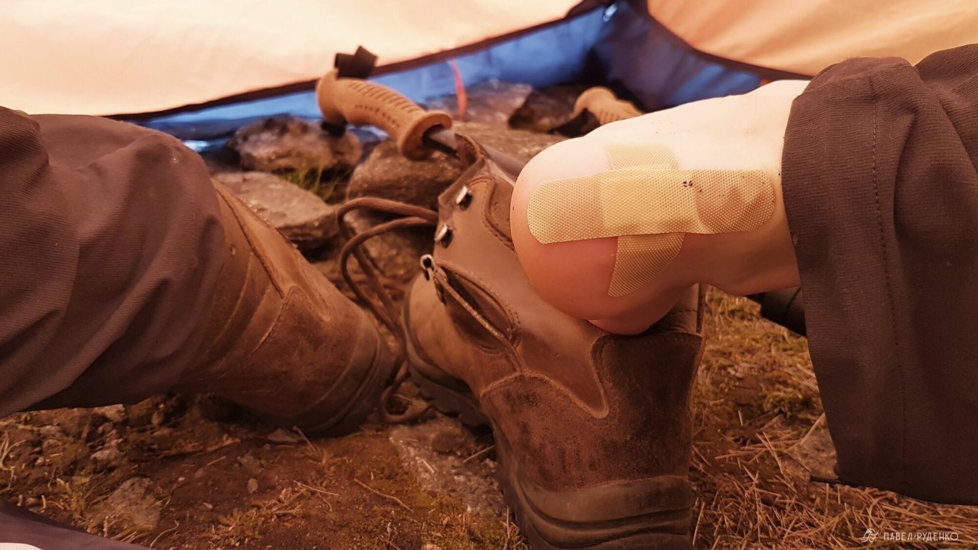 Im täglichen Leben achte ich nicht auf Kratzer usw., aber bei der Wanderung muss man alle Schäden sorgfältig überwachen und sorgfältig behandeln. Selbst ein kleiner Kratzer am Finger kann sich entzünden, verrotten und es wird passieren, dass es schmerzhaft ist, einen Trekkingstock, eine Axt zu nehmen, zu essen, ein Zelt aufzustellen und einen Brenner anzuzünden. Wenn Sie anfangen, Ihr Bein zu reiben, halten Sie sofort an, kleben Sie ein Pflaster auf, korrigieren Sie die Zehe und binden Sie den Schuh. Dieses Problem tritt hauptsächlich in Gruppenwanderungen auf. Sie kennen die Leute wenig, es ist unangenehm zu fragen, zu warten usw., aber Sie müssen es unbedingt tun, sonst werden Sie sich langsam anstrengen, sich selbst verletzen und das allgemeine Tempo auf der Route reduzieren.