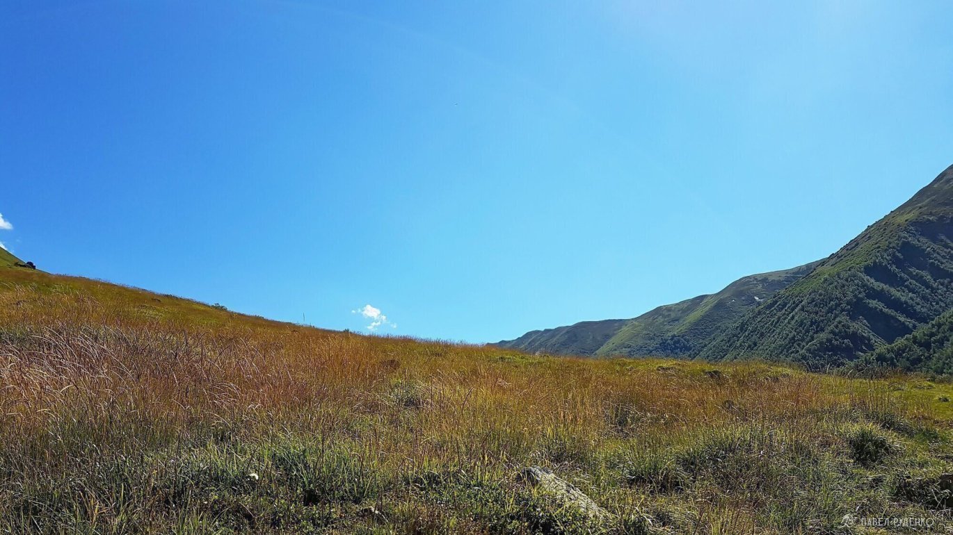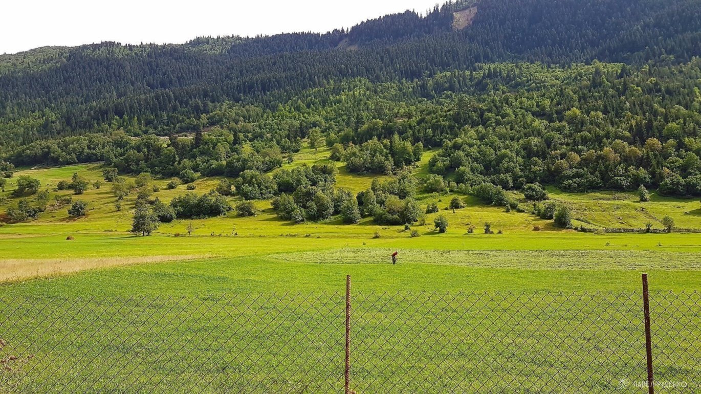 Construction of a ski resort is underway on the hill. We have to walk a small section of the road, but then the most panoramic viewpoint of the ridges begins. After the stream, I go down into the gorge, horses are grazing on the right, a large but unremarkable eagle is sitting on a rock on the left, and I take off my backpack and fall on a haystack.