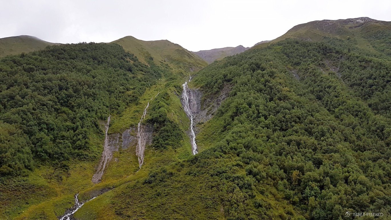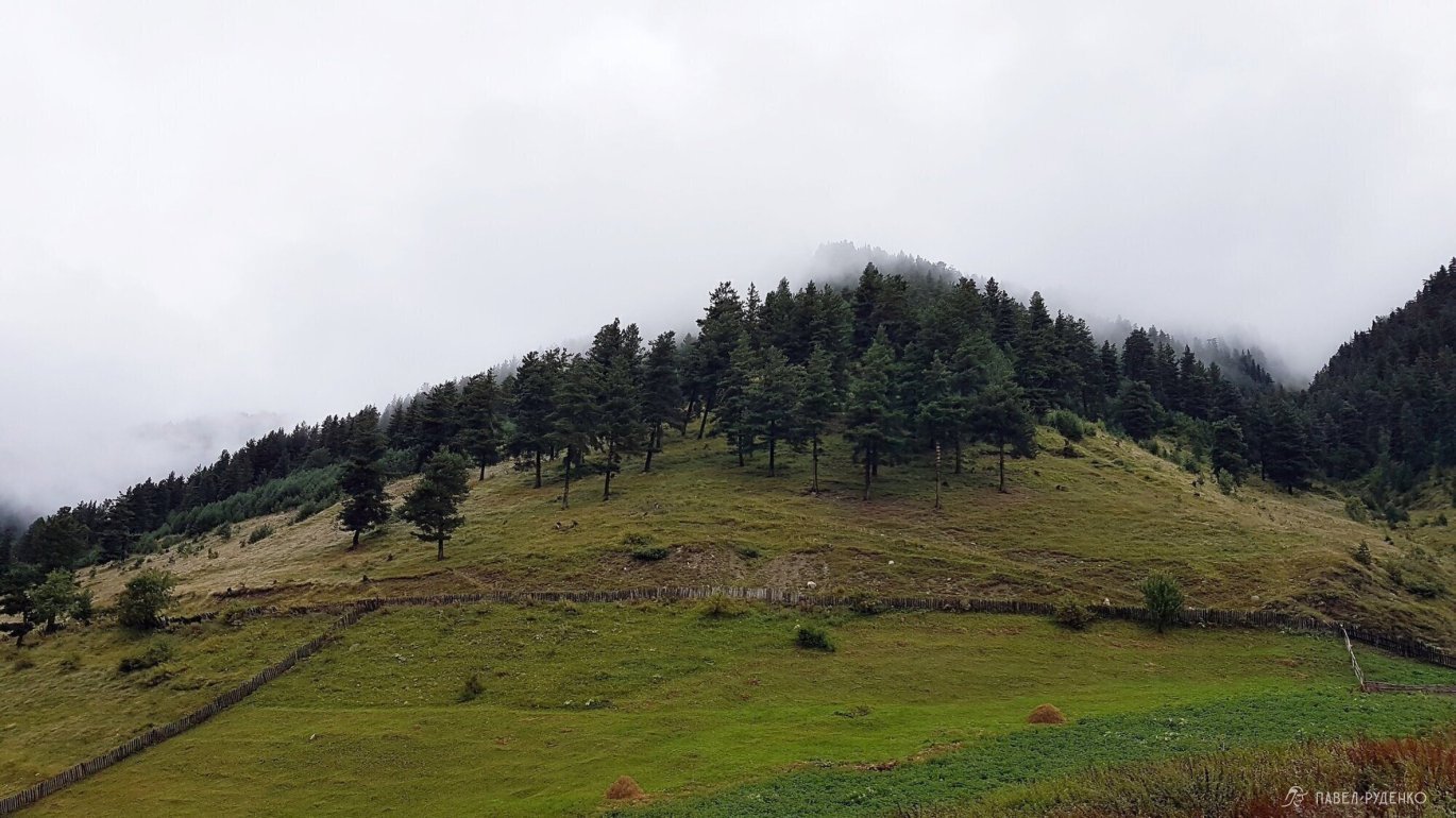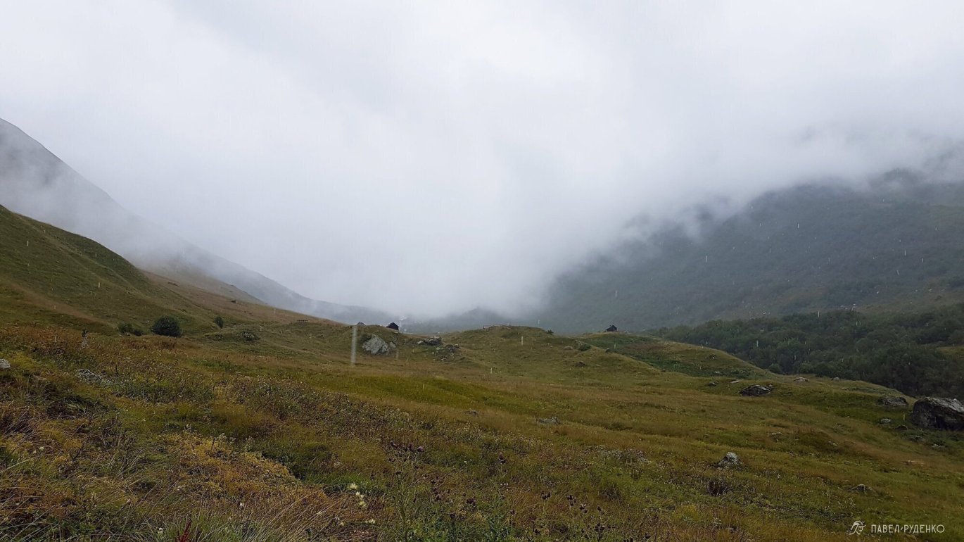 With попутчиками from the river, we break through the tall and wet grass. Ahead is a Scandinavian landscape, houses in the clouds by the cliff. The rain gives the opportunity to see how the abundant channels of streams cut through the mountains.
