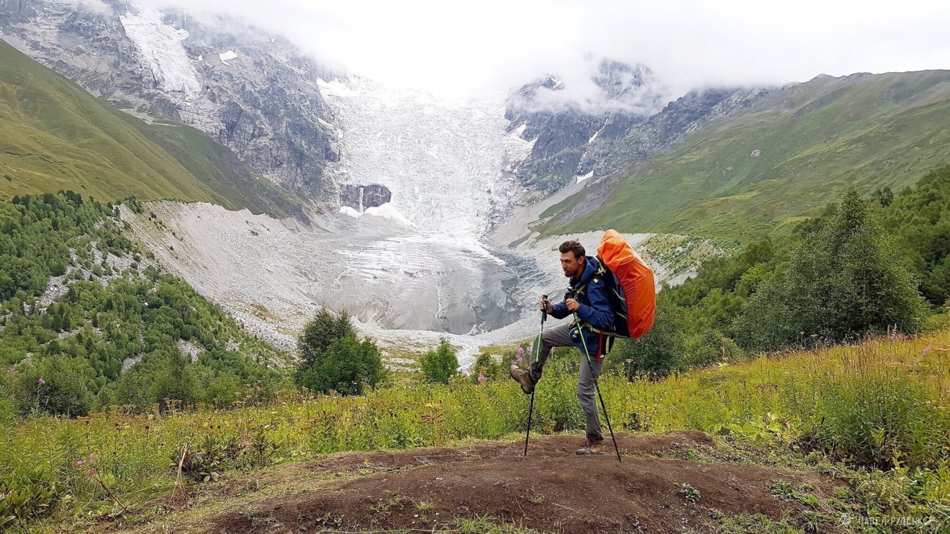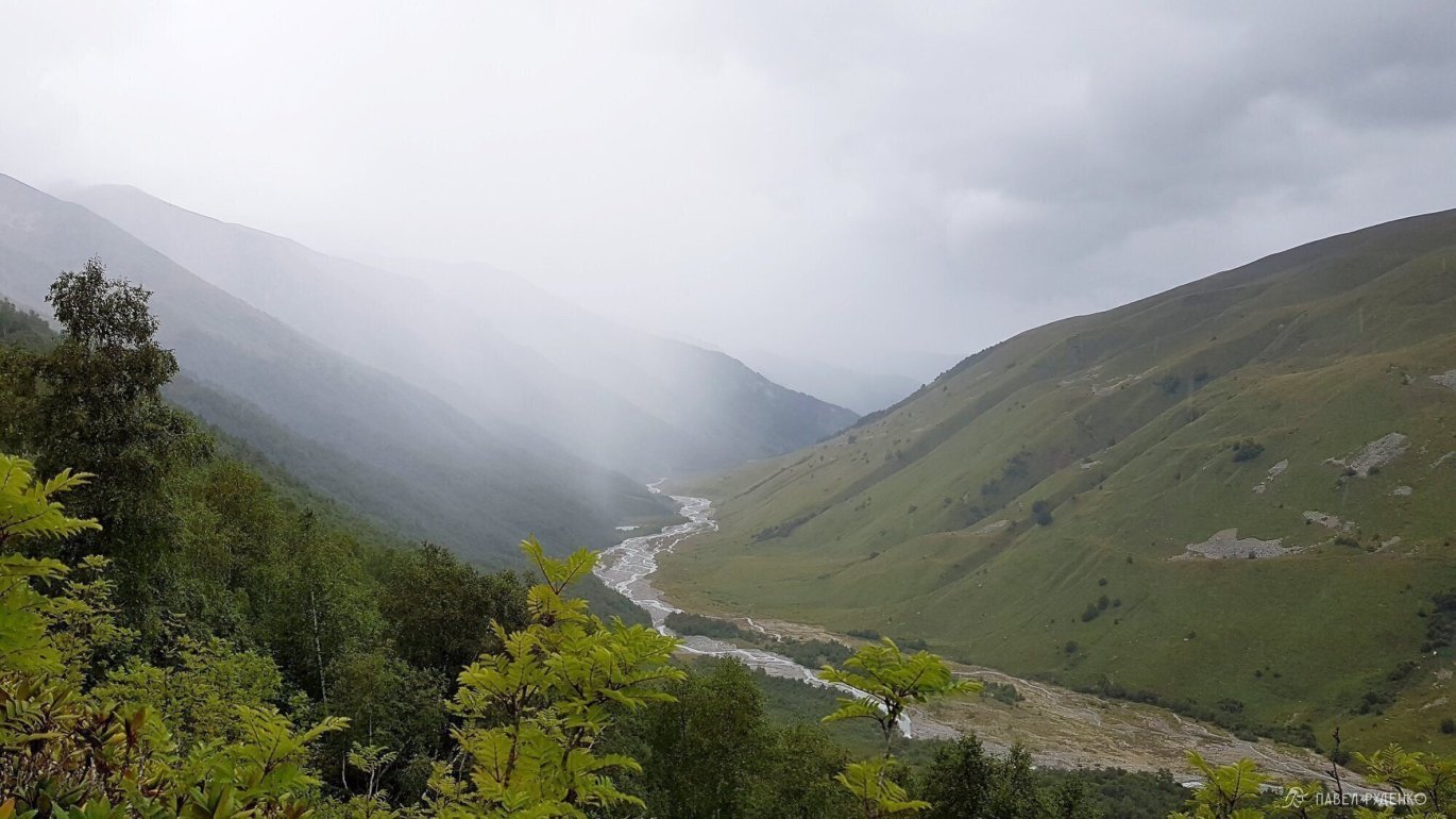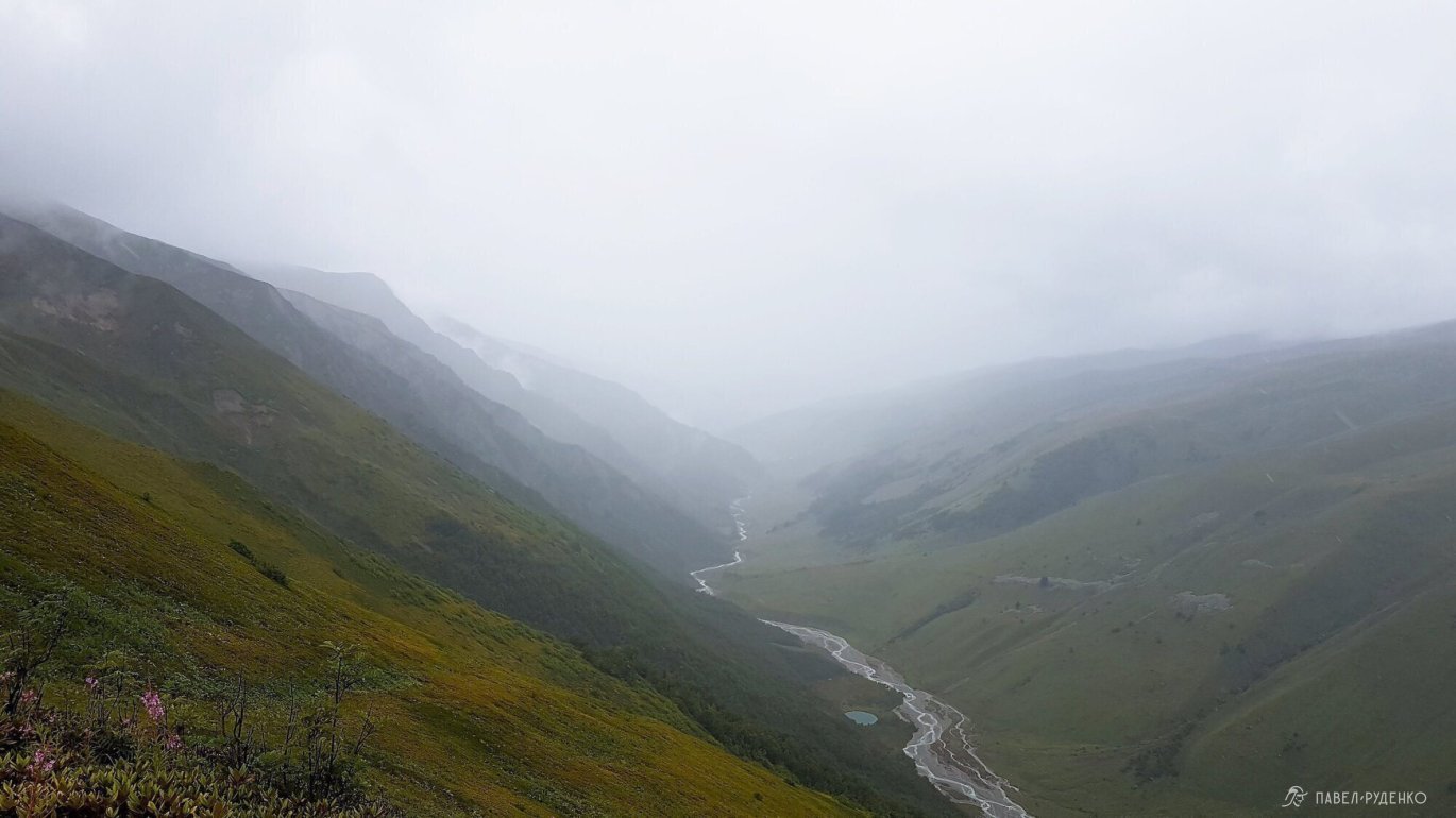 Ahead is the pass, I climb and feel vibrations in my chest from the roar of the falling pieces of the glacier. The noise is such that it resonates throughout the gorge. There is wind and incessant rain on the pass.