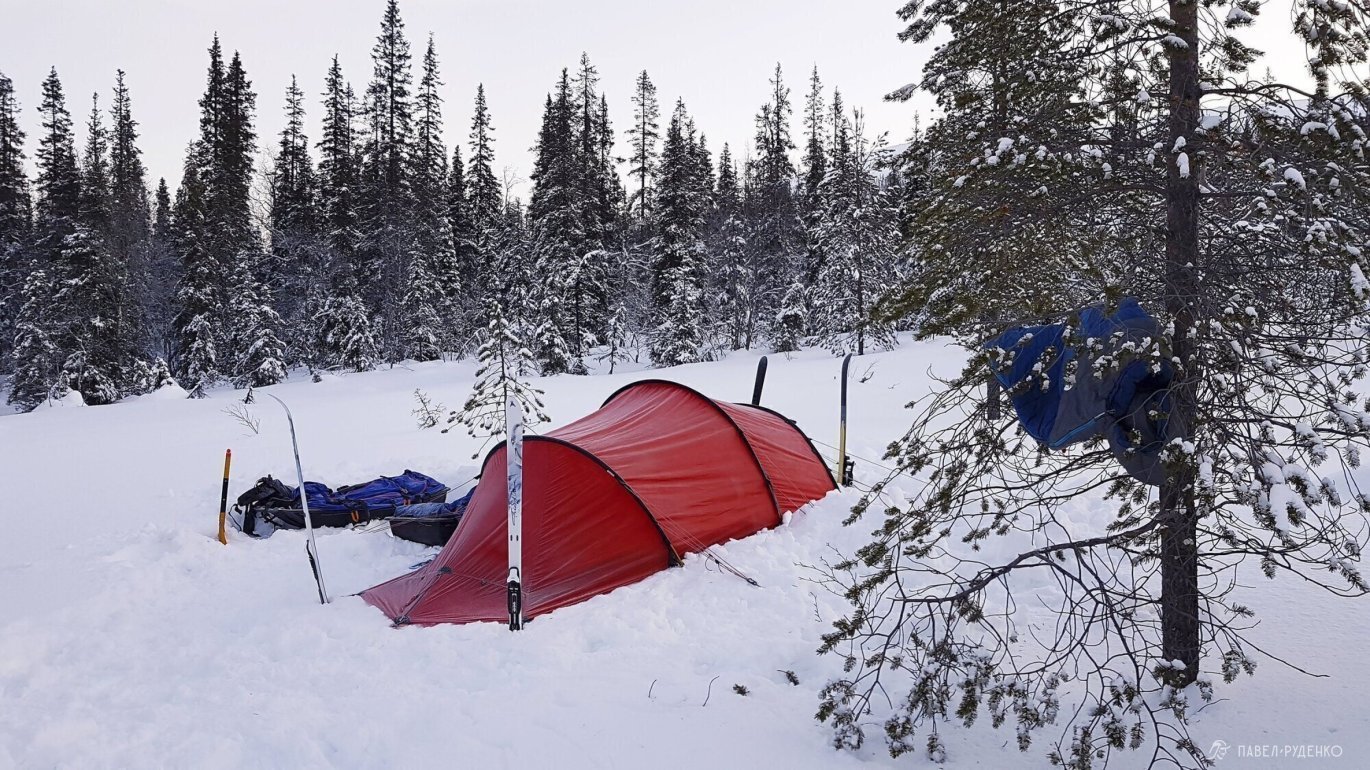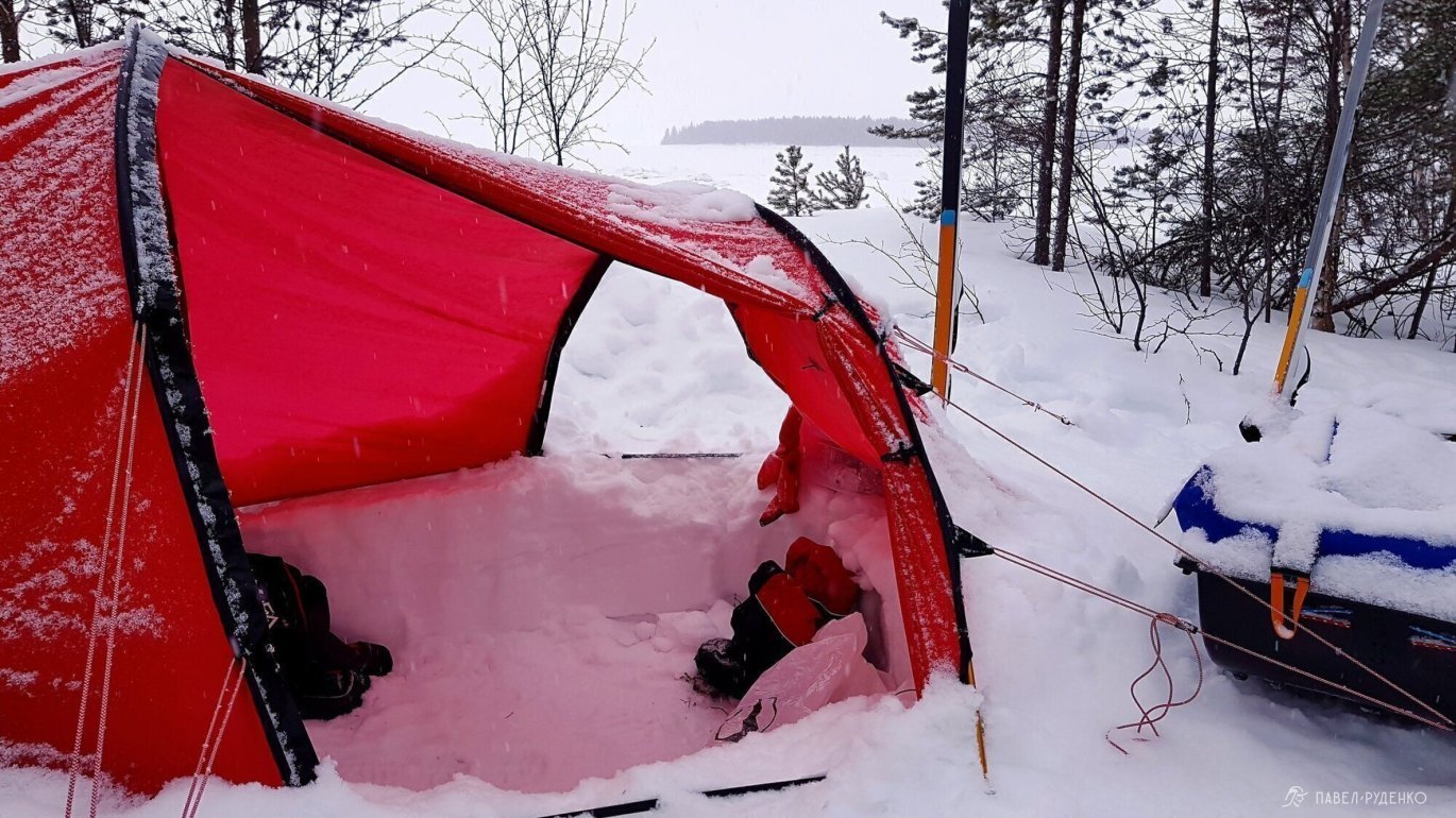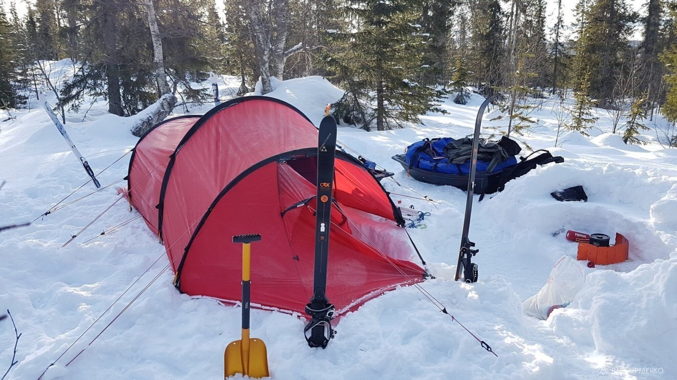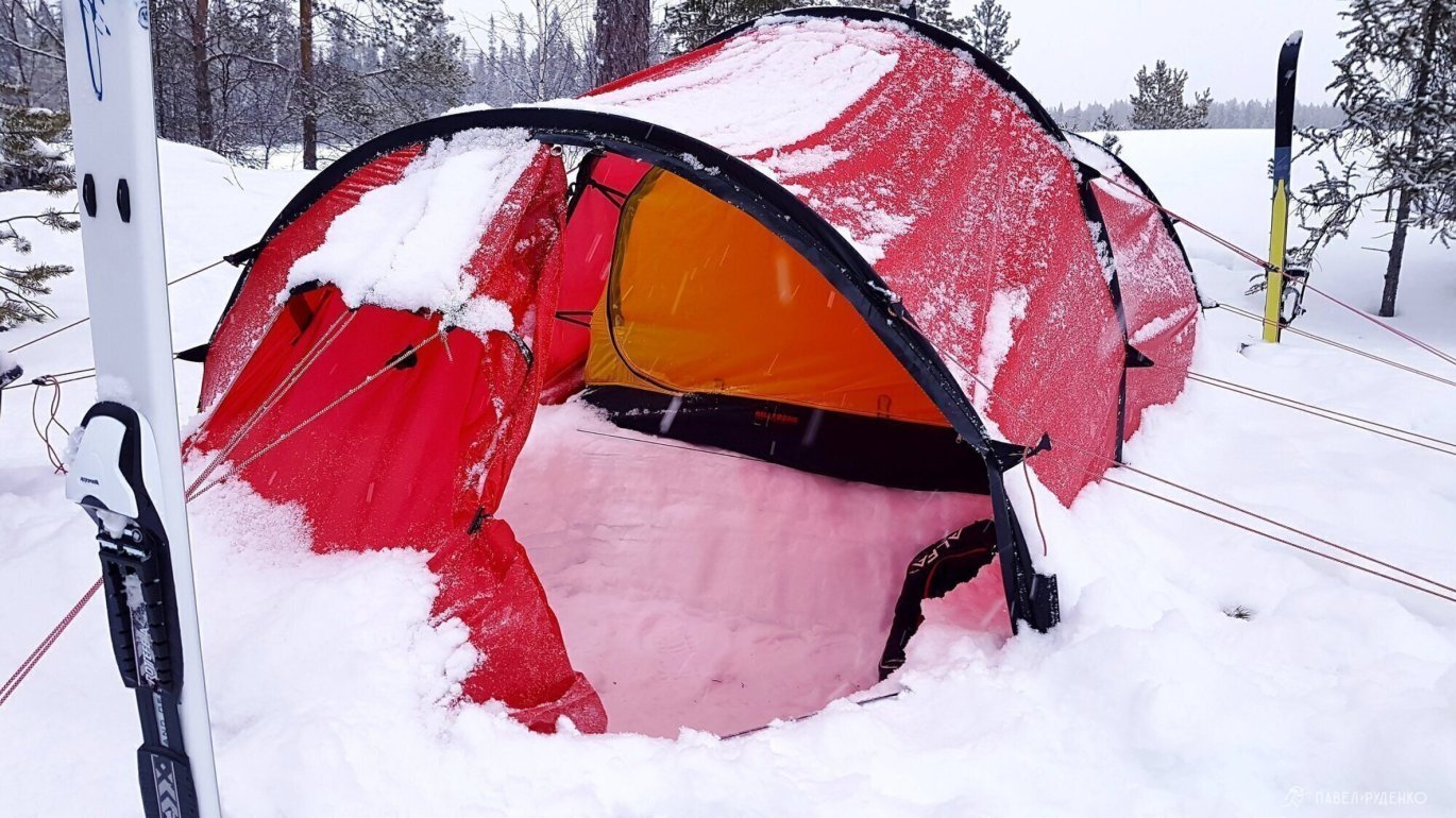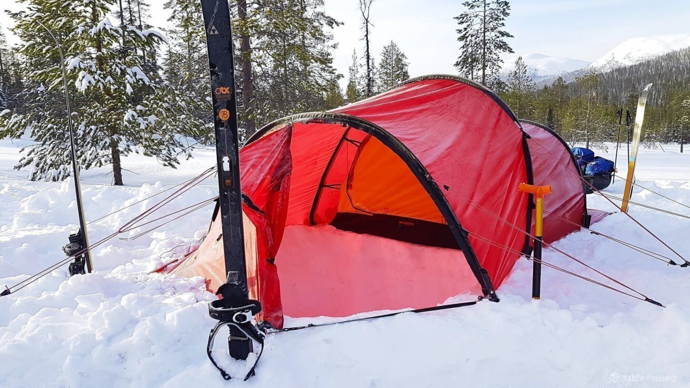 I tested the Hilleberg Nallo 2 GT, and it's simply wonderful. All the details are thought out and inspiring. The huge vestibule allows you to store things and food. If necessary, you can comfortably cook in it, digging a hole and hanging your legs, sitting in the tent and eating. It's easy to set up, we secured it with snow anchors and skis. The internal volume of the tent is small, which allows it to be breathed in. I liked the tunnel design.