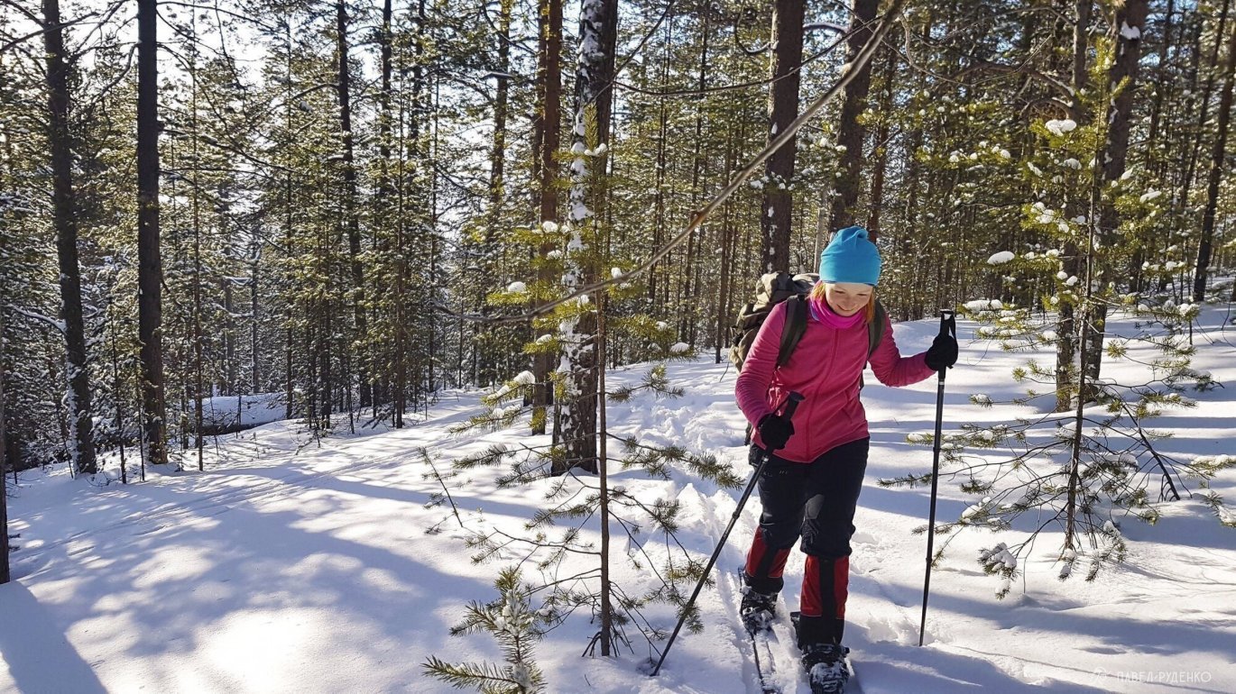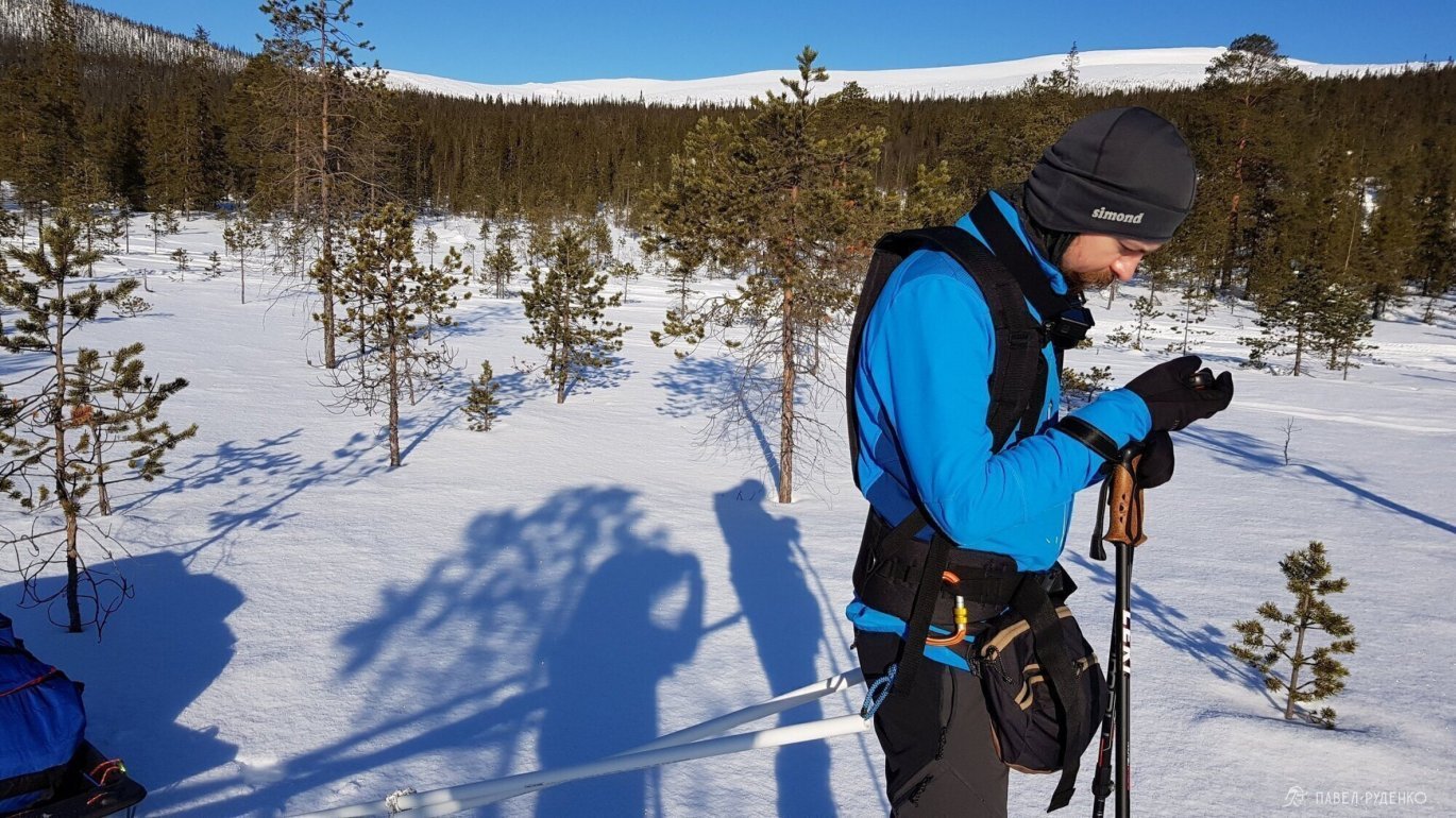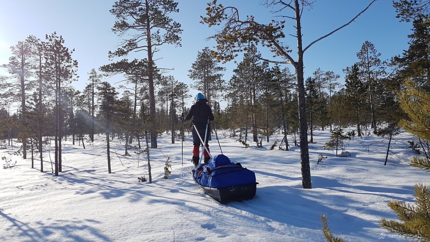 The pulkas proved themselves from their best side. Flat areas of treeless terrain are covered as easily as possible, the back is always unloaded and does not sweat, there is no load on the knees. With a slight rise, the camus allows you to move forward, and with a stronger one, when the skis start to slip, we went zigzag or ladder-style. A dense forest with bushes, stones, and frequent elevation changes of several meters was a serious problem. The speed of movement noticeably decreased, the pulkas bumped into trunks or slid into ravines. We had to change the route. The route had to be built through open areas, in places of marshes and sparse forests.
