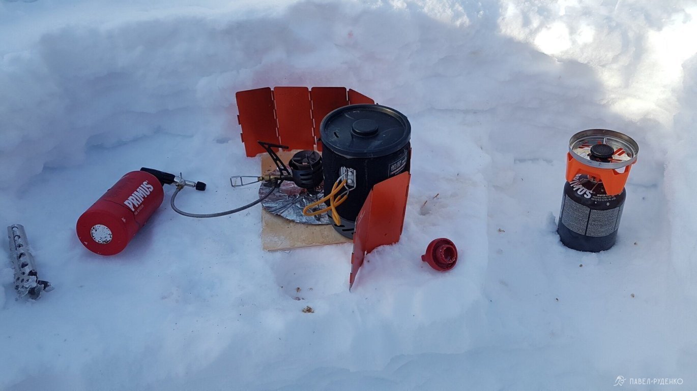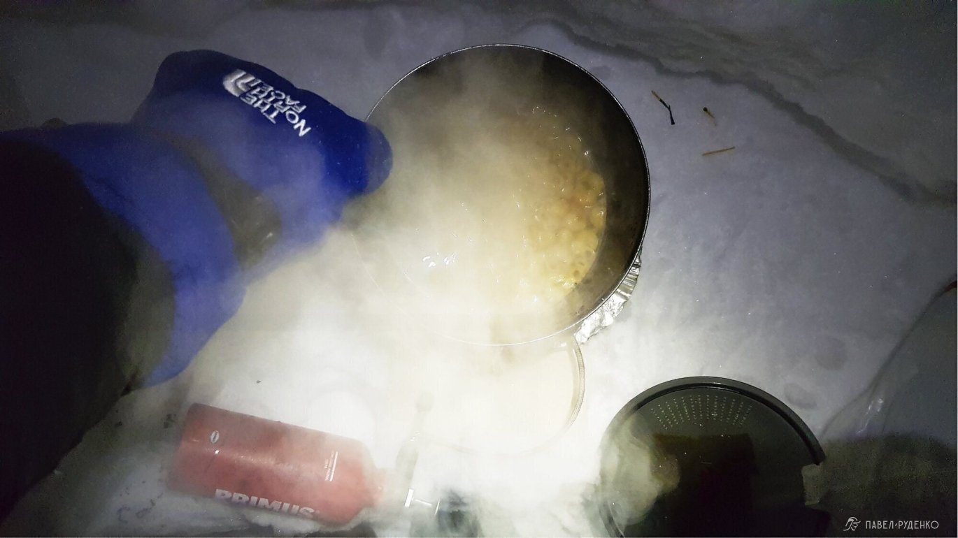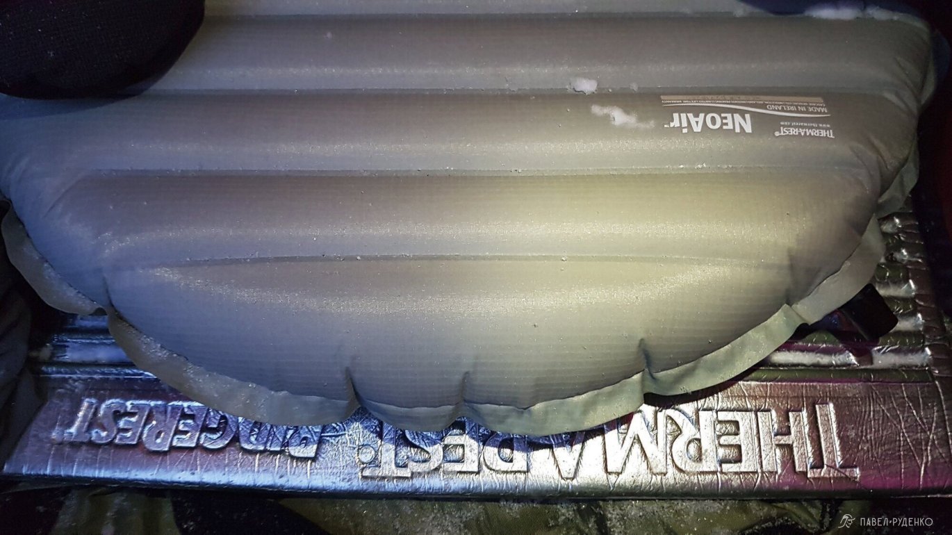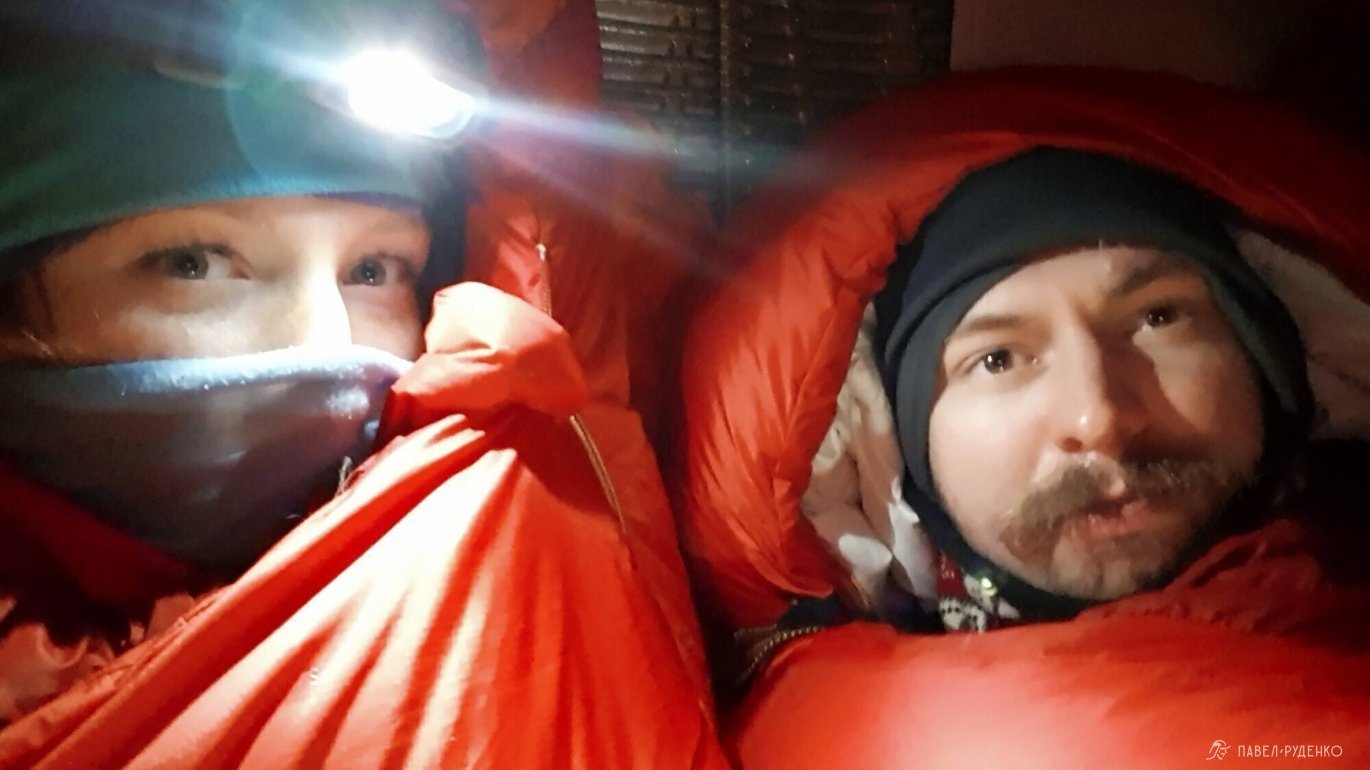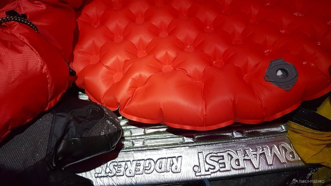 I used a Therm-a-Rest RidgeRest SOLite foam mat with an R-value of 2.1 and a Therm-a-Rest Neo Air XTherm inflatable mat with an R-value of 6.9. The sleeping bag is Mountain Equipment Glacier Expedition -35. We put a страховочный The North Face Aleutian -7 on top of the sleeping bag as a condensation barrier, but there was no need for insulation in it, I won't take it next time.