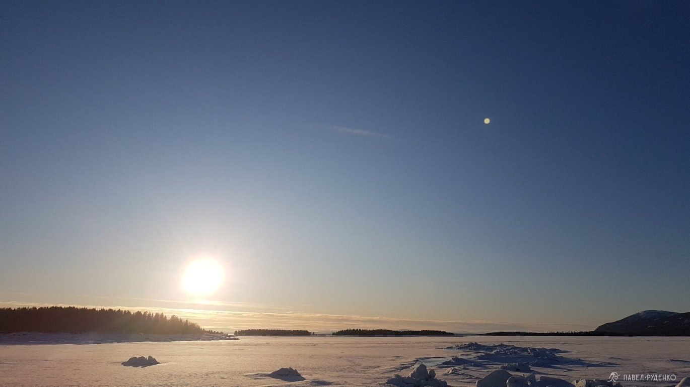 We wanted to reach the islands in the White Sea Bay, but the ice was unstable due to temperature fluctuations. Visually, everything was in order, there were no holes or dark snow, but the current strengthens near the islands and undermines the ice. I called the Emergencies Ministry to find out the ice situation, but they didn't have the information. I dialed 101, and they promptly passed my number to the head of the rescue squad in Kandalaksha, and he described the situation in detail. We decided to set up camp on the shore. The climate near the sea is different, it was the coldest night, although the forecast didn't differ from the previous one.