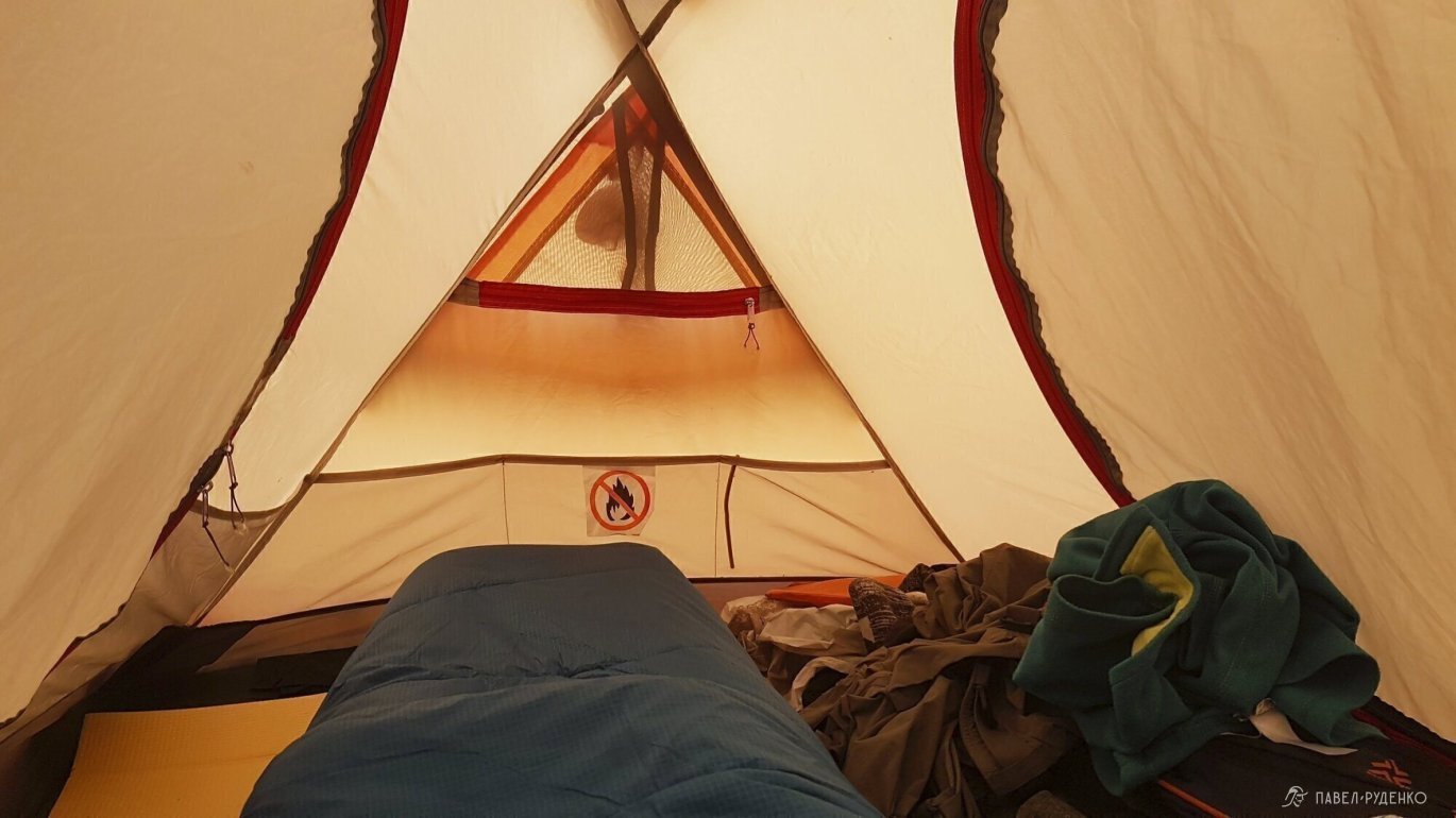 Unlike the similarly designed MSR Elixir, the vestibule arc in Ay Petri does not stretch the inner tent. Therefore, it will be comfortable inside for a влюблённой couple of small dimensions. I often went solo, this is maximum comfort. All things inside, cooking and entrance in one vestibule, but the second one is inactive, so for singles, the Normal Zero 2 and Vega Equipment models with one entrance are more preferable.